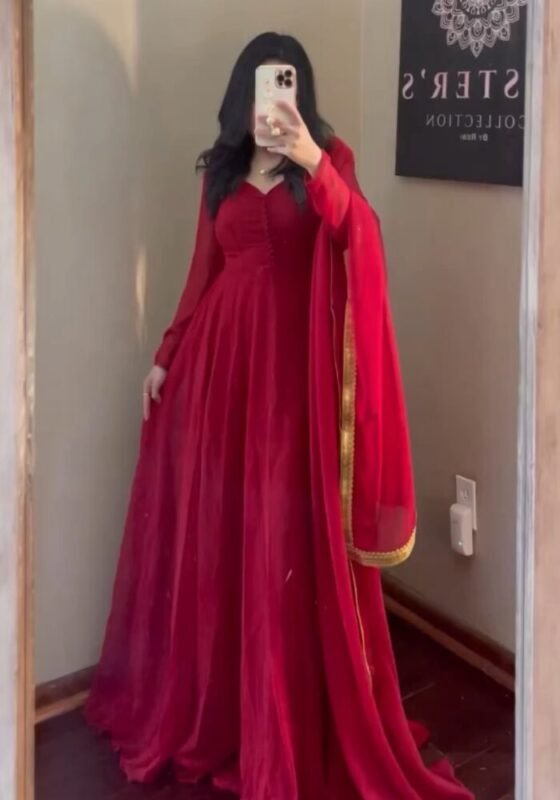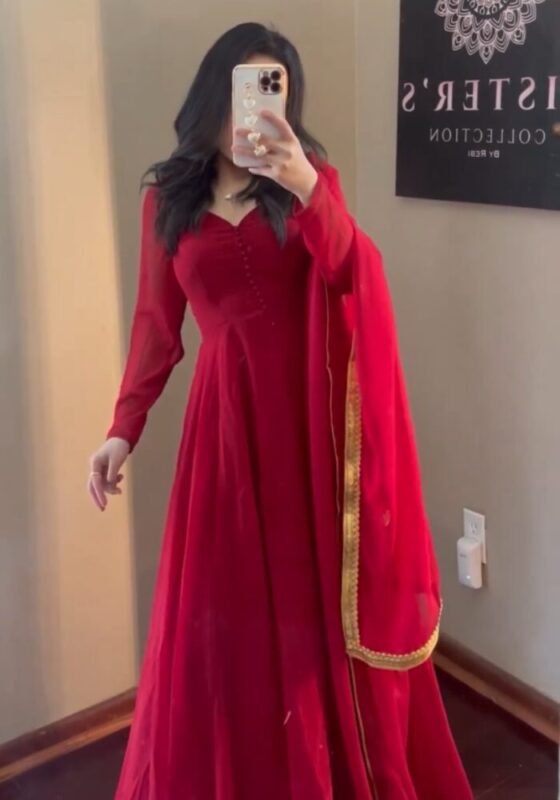 Effortless elegance meets festive charm in this beautiful Nyra-pattern Georgette Set. Designed in a rich red shade, it features: ❤️