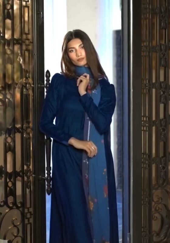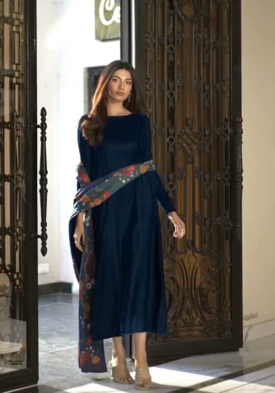 Crown Blue Velvet Kurta with White Print Velvet Dupatta