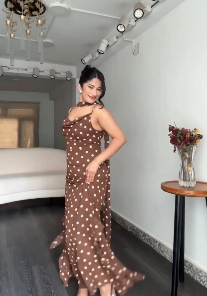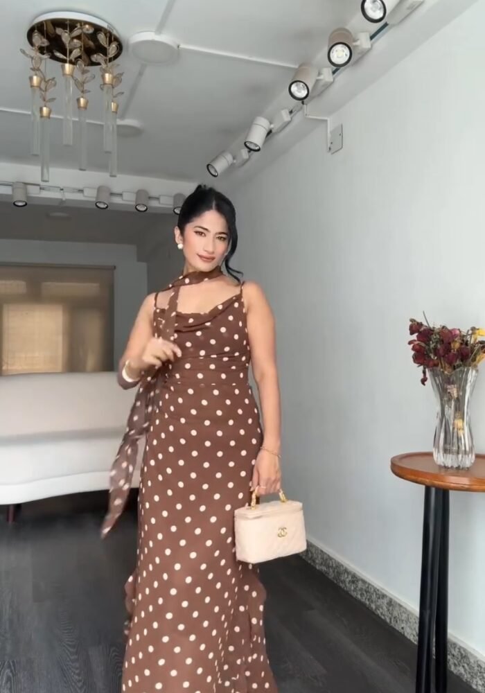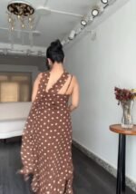 Turn heads with every step in this stunning brown polka dot georgette dress 🤎