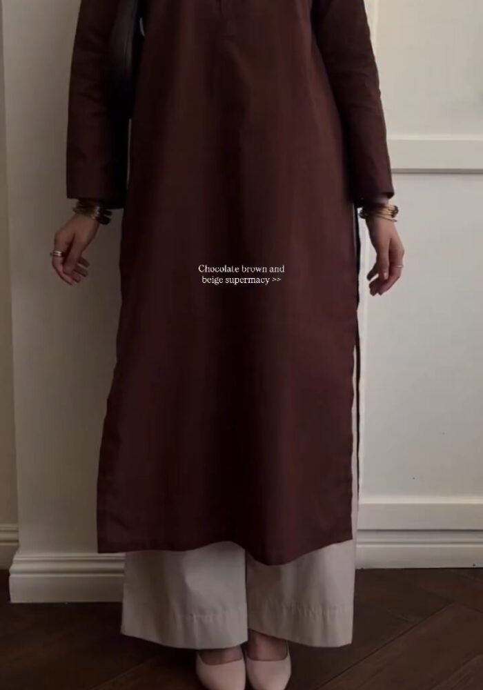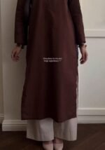 This solid brown Cotton kurta paired with crisp white palazzo pants is the perfect blend of simplicity and sophistication. The Pure Cotton fabric feels breathable and smooth on the skin, while the straight silhouette keeps the look polished and office-ready.