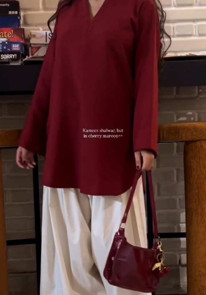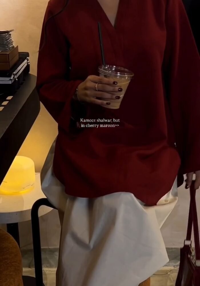 The rich maroon kurta paired with flowy off-white Cotton Farsi bottoms creates a perfect balance of bold and subtle 🌿