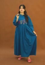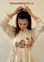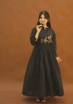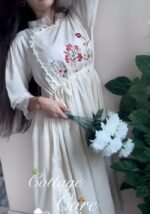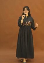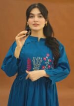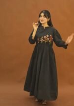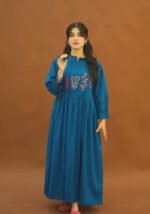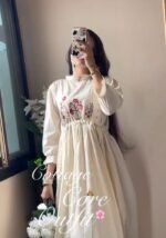 This beautiful dress features intricate floral thread embroidery on the yoke and stylish fabric button detailing along the neckline, giving it a graceful and sophisticated look.