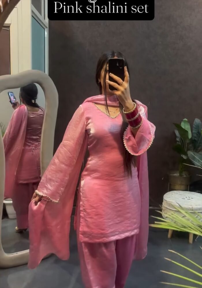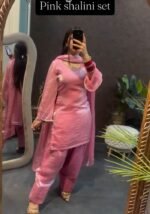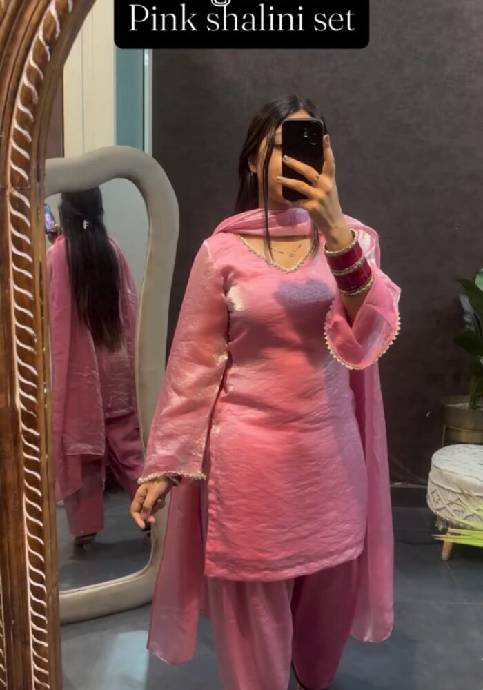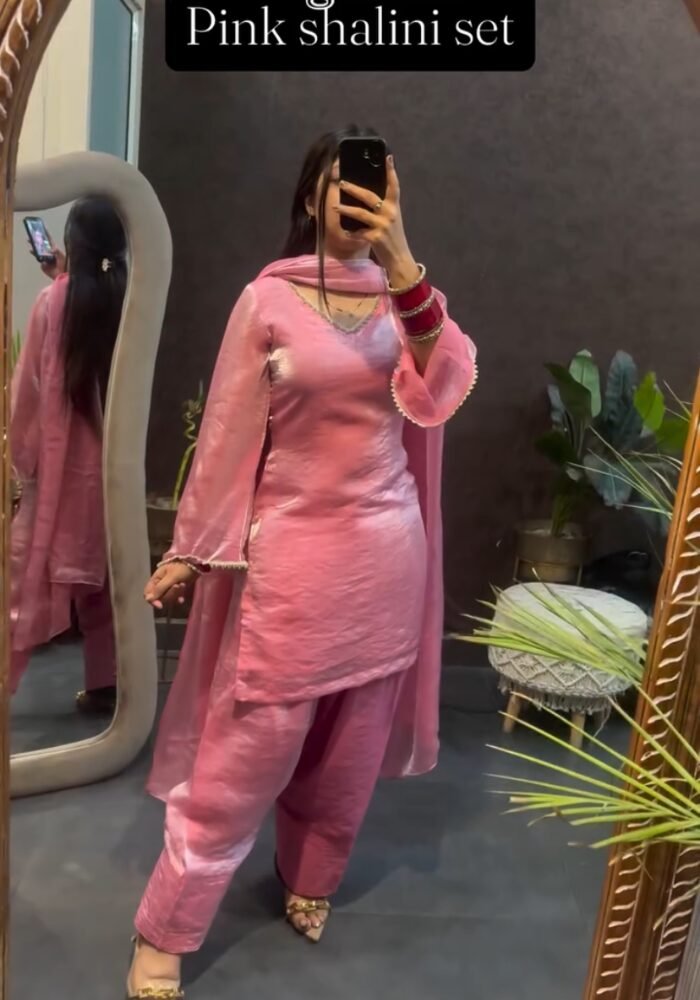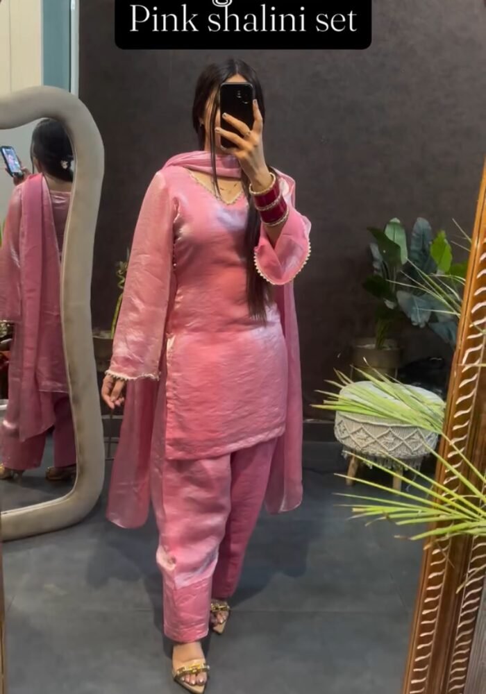 Step into modern wedding glamour with our Pink Shalini Set, crafted in luxurious Fendi fabric that gives a soft sheen and rich texture.