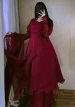Step into timeless elegance with this gorgeous maroon georgette kurta plazo dupatta set.
